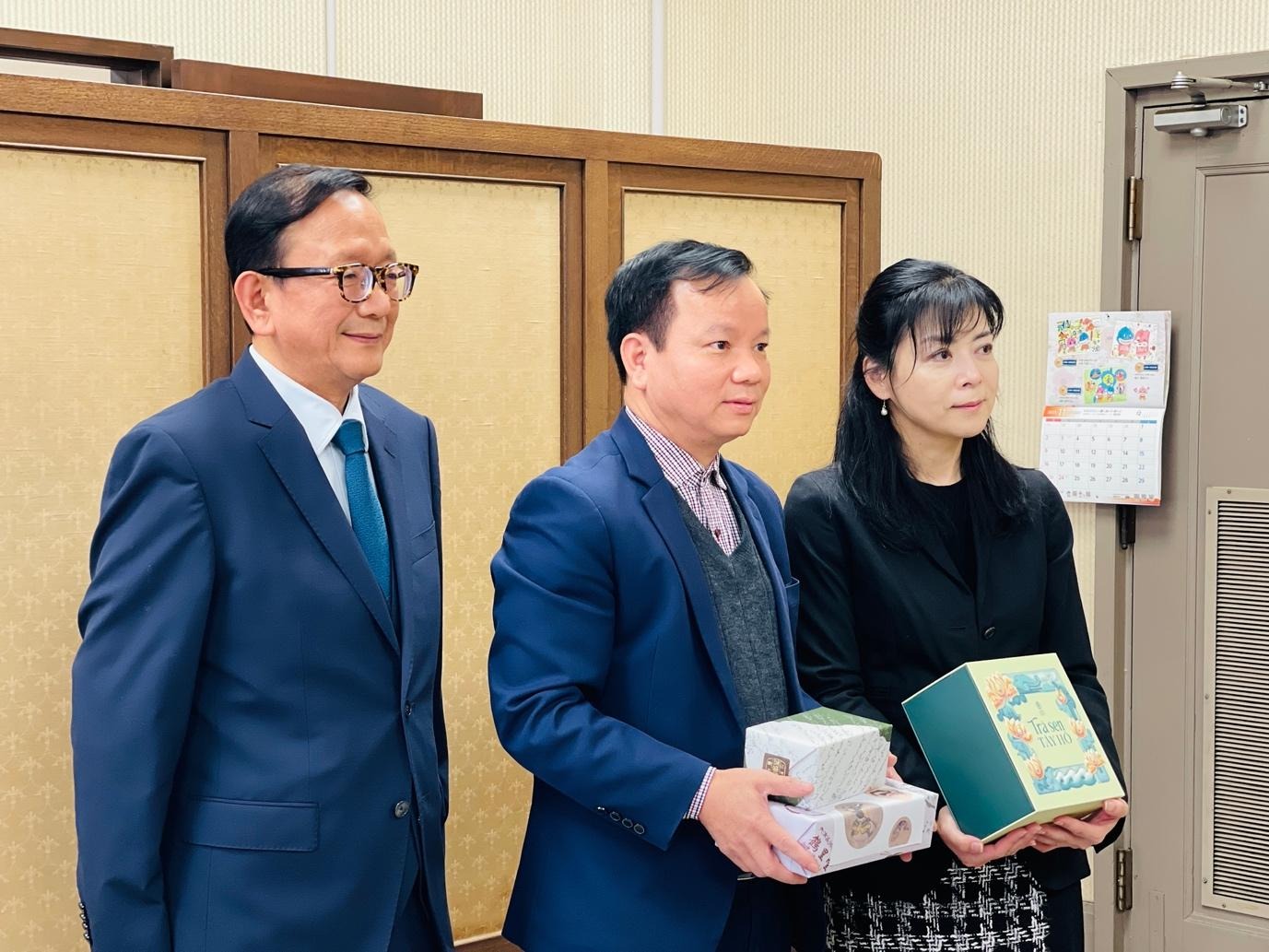 Phó Thống đốc tỉnh Shiga Kishimoto Orie (bìa phải) và ông Yoshimasa Nakasaku - Phó Chủ tịch Hiệp hội Doanh nghiệp tỉnh Shiga (bìa trái) chụp ảnh lưu niệm cùng GS. Vũ Văn Yêm