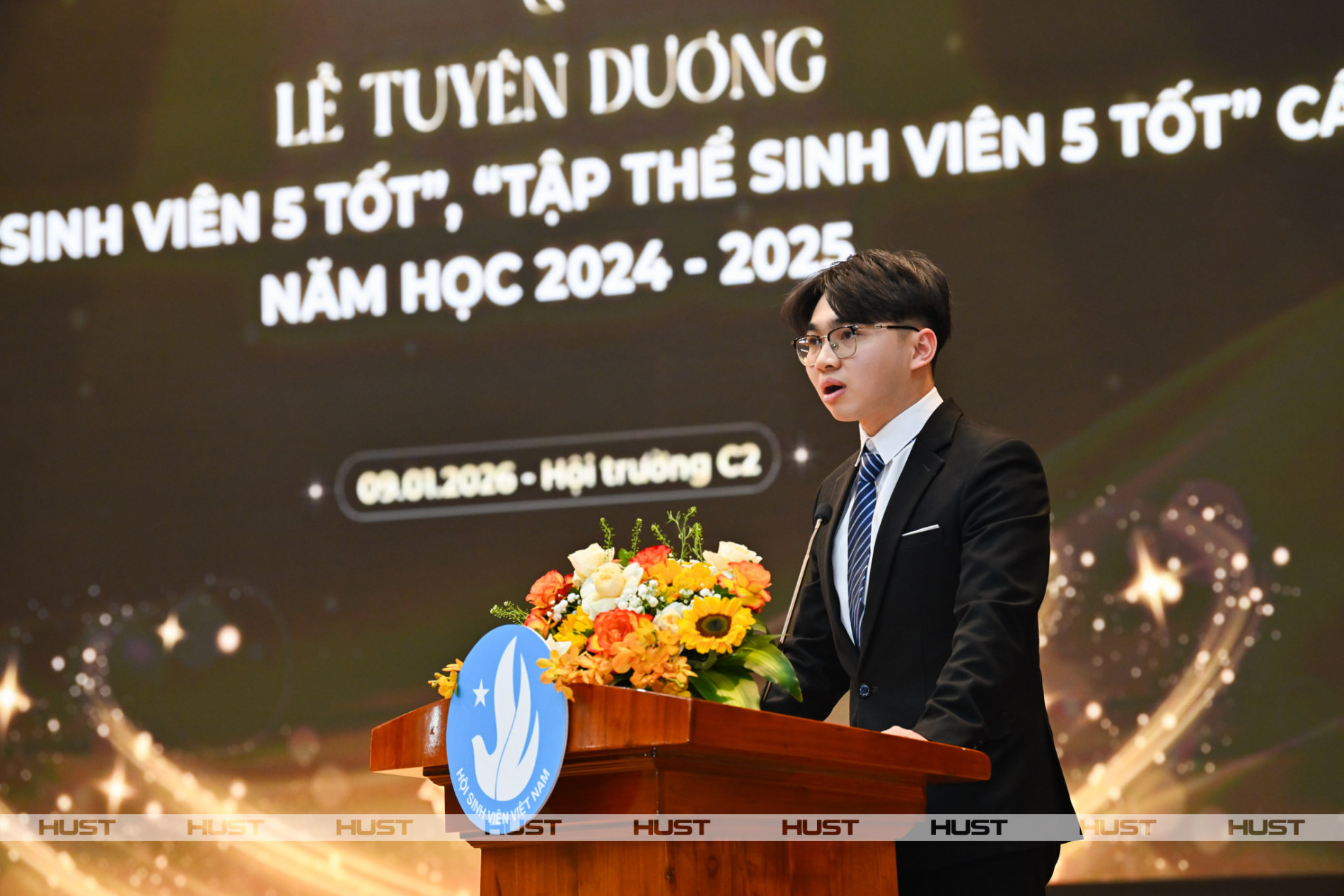 Phát biểu tại chương trình, đại diện Hội Sinh viên Đại học nhấn mạnh: Danh hiệu “Sinh viên 5 tốt”, “Tập thể Sinh viên 5 tốt” không chỉ là phần thưởng xứng đáng cho những nỗ lực bền bỉ mà còn là minh chứng cho cả một hành trình đầy mồ hôi và quyết tâm. Đó là những đêm miệt mài học tập, vượt qua các kỳ thi đặc trưng của Bách khoa; là những ngày hè tình nguyện hết mình vì cộng đồng; là những giờ rèn luyện thể thao bền bỉ để chinh phục giới hạn của bản thân.