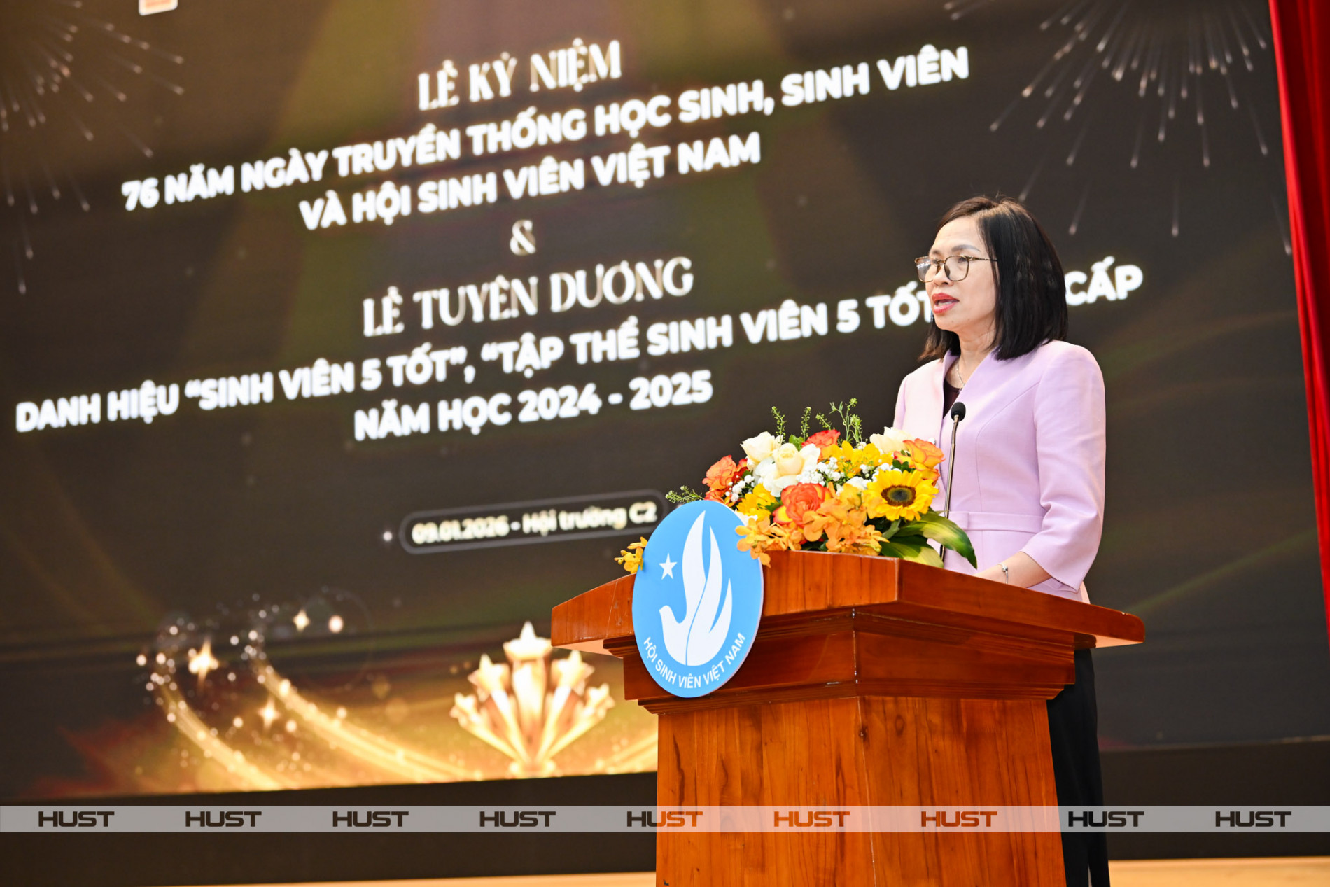 Phát biểu chúc mừng tại buổi lễ, PGS. Phạm Thanh Huyền – Trưởng Ban Công tác Sinh viên, Đại học Bách khoa Hà Nội – thay mặt lãnh đạo nhà trường biểu dương và chúc mừng các sinh viên đạt danh hiệu “Sinh viên 5 tốt” cấp Trung ương, “Sinh viên 5 tốt”, “Tập thể Sinh viên 5 tốt” các cấp năm học 2024 – 2025.