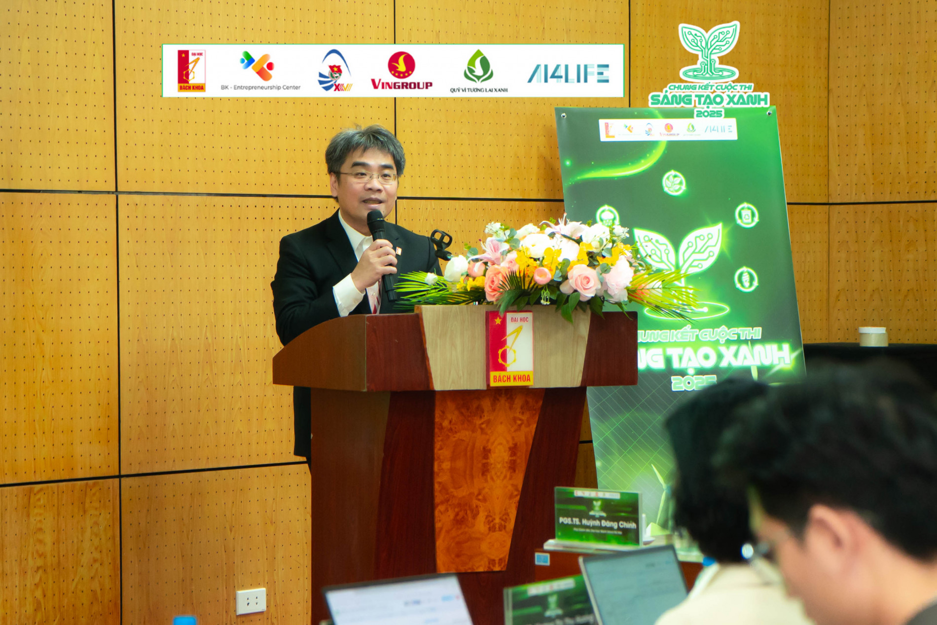 Phát biểu khai mạc với tâm thế đầy tự hào, PGS.TS. Huỳnh Đăng Chính - Phó Giám đốc Đại học Bách khoa Hà Nội khẳng định vị thế tiên phong của Nhà trường: "Đại học Bách khoa Hà Nội không chỉ tổ chức một cuộc thi, chúng tôi đang kiến tạo một hệ sinh thái. Sáng tạo xanh là nơi kết nối chặt chẽ "thế chân kiềng": Nhà trường - Doanh nghiệp - Chuyên gia. Những giải pháp có mặt hôm nay là lời tuyên bố đanh thép rằng: Sinh viên Việt Nam không chỉ giỏi lý thuyết, mà hoàn toàn đủ bản lĩnh để tạo ra những công nghệ lõi, giải quyết trực diện các thách thức môi trường cấp bách nhất."