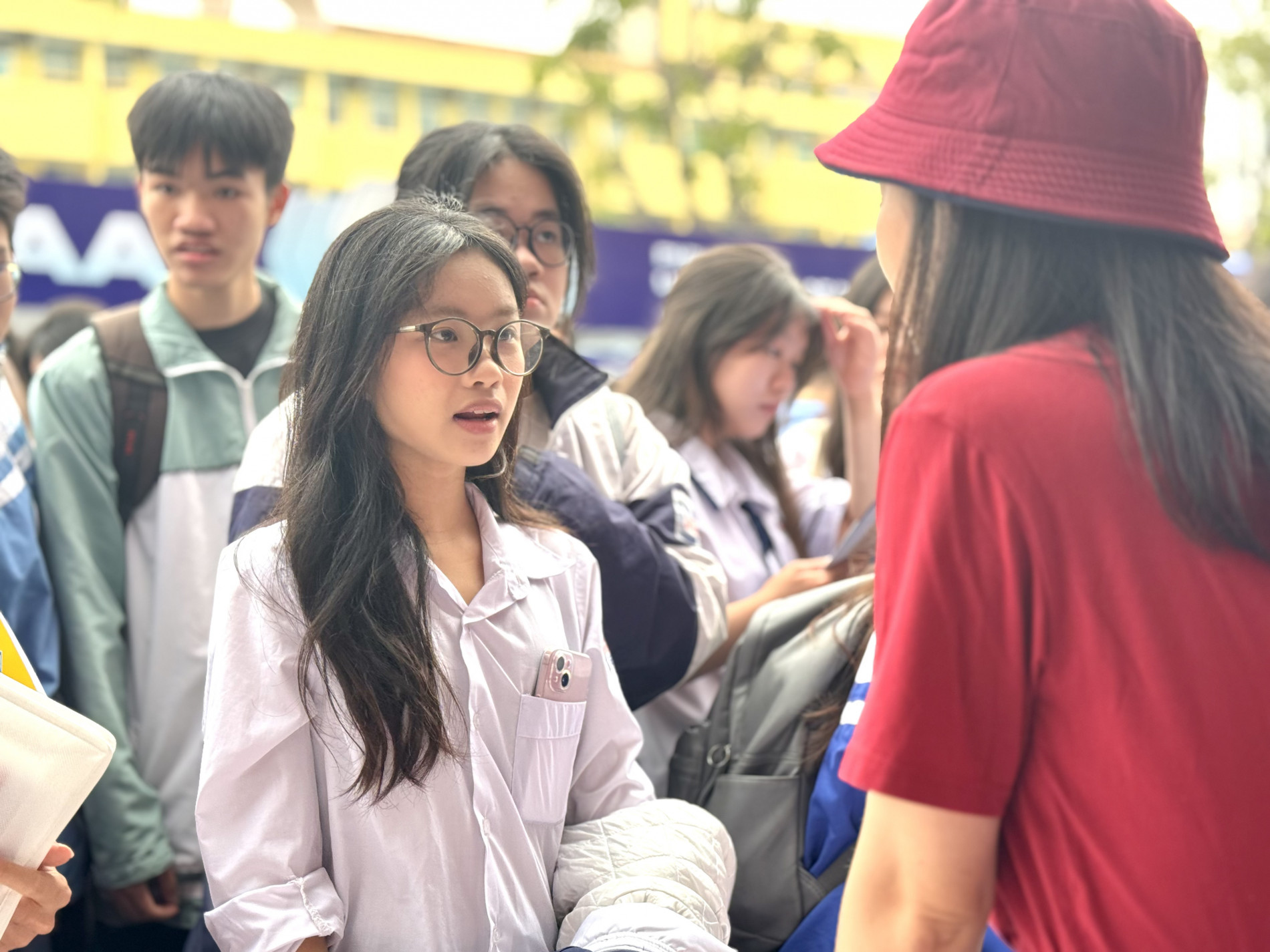 Tại gian tư vấn Đại học Bách khoa Hà Nội, phụ huynh và học sinh từ các trường cấp 3 lân cận xếp thành hàng dài, chờ đến lượt được tư vấn. Đoàn người đứng chật như nêm, nhưng gương mặt ai cũng rạng rỡ nụ cười vì được hỏi – đáp, nghe tư vấn, định hướng trực tiếp từ thầy cô Bách khoa Hà Nội. Đội ngũ thầy cô Bách khoa, với sự chuyên nghiệp của mình, kiên nhẫn giải đáp từng thắc mắc, gỡ rối lo âu cho từng phụ huynh và học sinh.