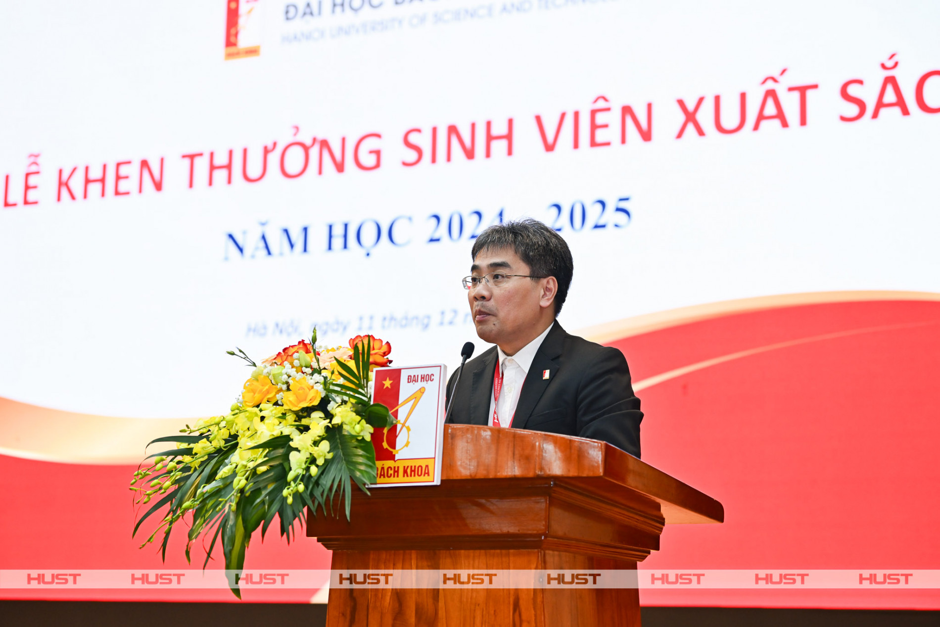 Phát biểu tại buổi lễ, PGS. Huỳnh Đăng Chính – Phó Giám đốc Đại học Bách khoa Hà Nội – gửi lời chúc mừng đến hơn 1000 sinh viên được khen thưởng tại buổi lễ. Phó Giám đốc Đại học Bách khoa Hà Nội ghi nhận hành trình học tập bền bỉ của các sinh viên từ những giờ lên lớp, nghiên cứu trong phòng thí nghiệm, tự học tại thư viện cho tới những đợt thực tập tại doanh nghiệp. Đó là những trải nghiệm tạo nên bản lĩnh của người Bách khoa, kiên trì, trách nhiệm và không ngừng hoàn thiện.