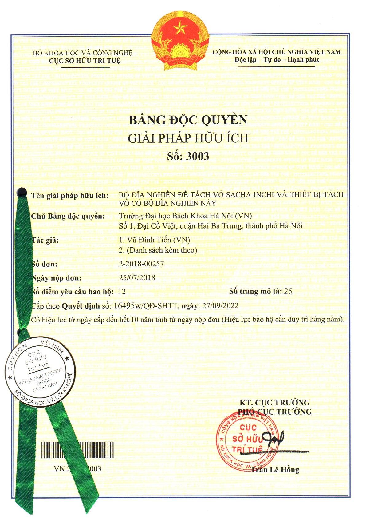 Tóm tắt: Giải pháp hữu ích đề cập đến bộ đĩa nghiền quả và hạt sacha inchi và thiết bị tách vỏ có bộ đĩa nghiền này có khả năng tách vỏ quả và bóc hạt hiệu quả, giảm tỷ lệ vỡ nhân hạt. Bộ đĩa nghiền bao gồm đĩa nghiền cố định, đĩa nghiền quay được bố trí tách khỏi đĩa nghiền cố định sao cho có thể điều chỉnh khoảng cách để tạo thành không gian nghiền, trên mỗi đĩa nghiền có các rãnh cắt được tạo cách đều tỏa tròn trên bề mặt, và bộ phận gạt liệu có các cánh gạt được bố trí cách đều tỏa tròn trên mặt đỉnh để gạt nguyên liệu vào không gian nghiền giữa hai đĩa nghiền.