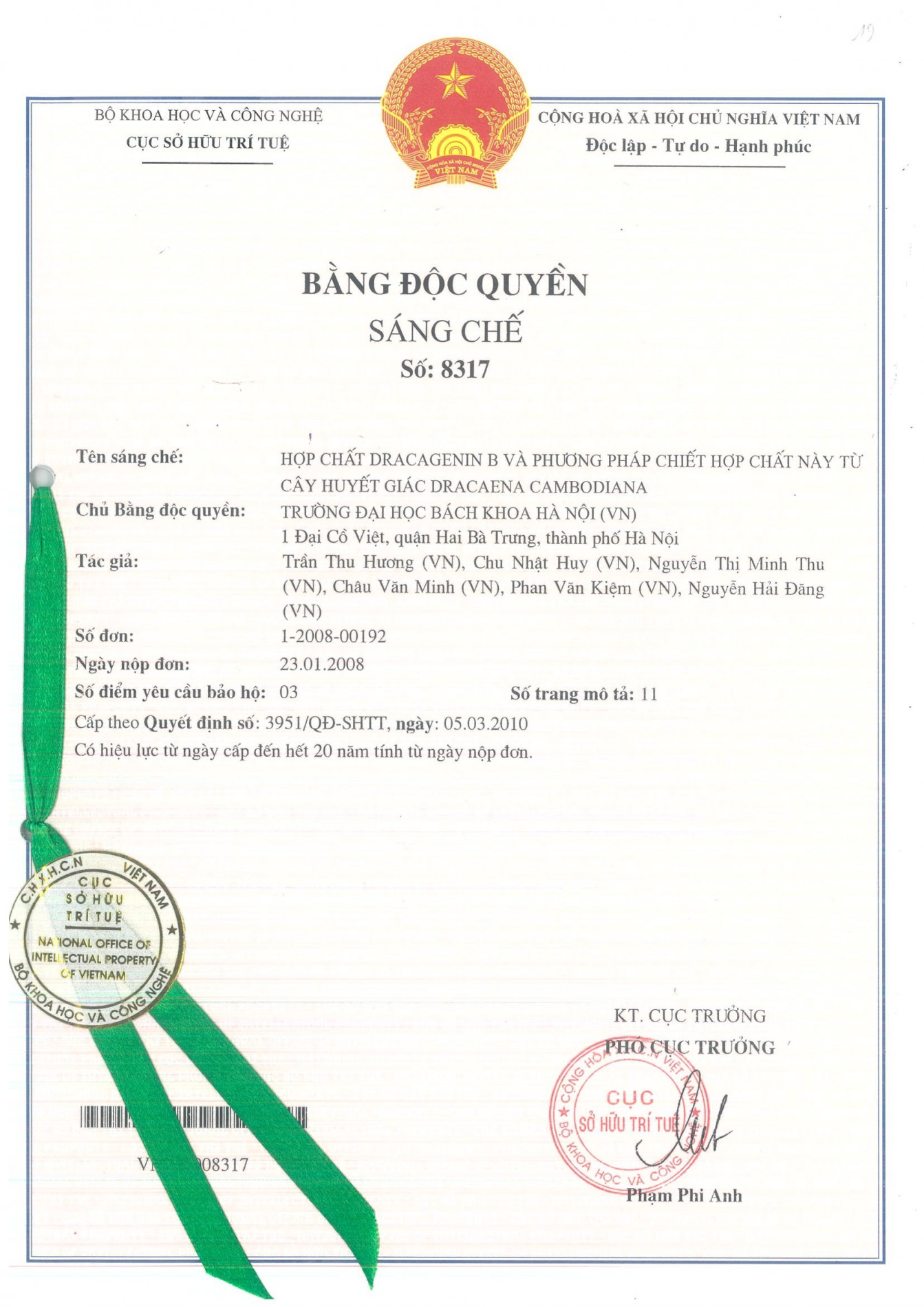 Tóm tắt: Sáng chế đề cập đến hợp chất dracagenin B có công thức cấu tạo và đến phương pháp chiết hợp chất này từ cây huyết giác Dracaena cambodiana mọc tại Việt Nam. Hợp chất theo sáng chế có tên khoa học theo IUPAC là (20R,22R,25S)-Spirost-5-ene- 1β, 3β, 14α-triol là hợp chất có hoạt tính mạnh kháng trực khuẩn mủ xanh Pseudomonas aeruginosa, kháng tụ cầu vàng Staphylococcus aureus và kháng nấm sợi Fusarium oxysporum.