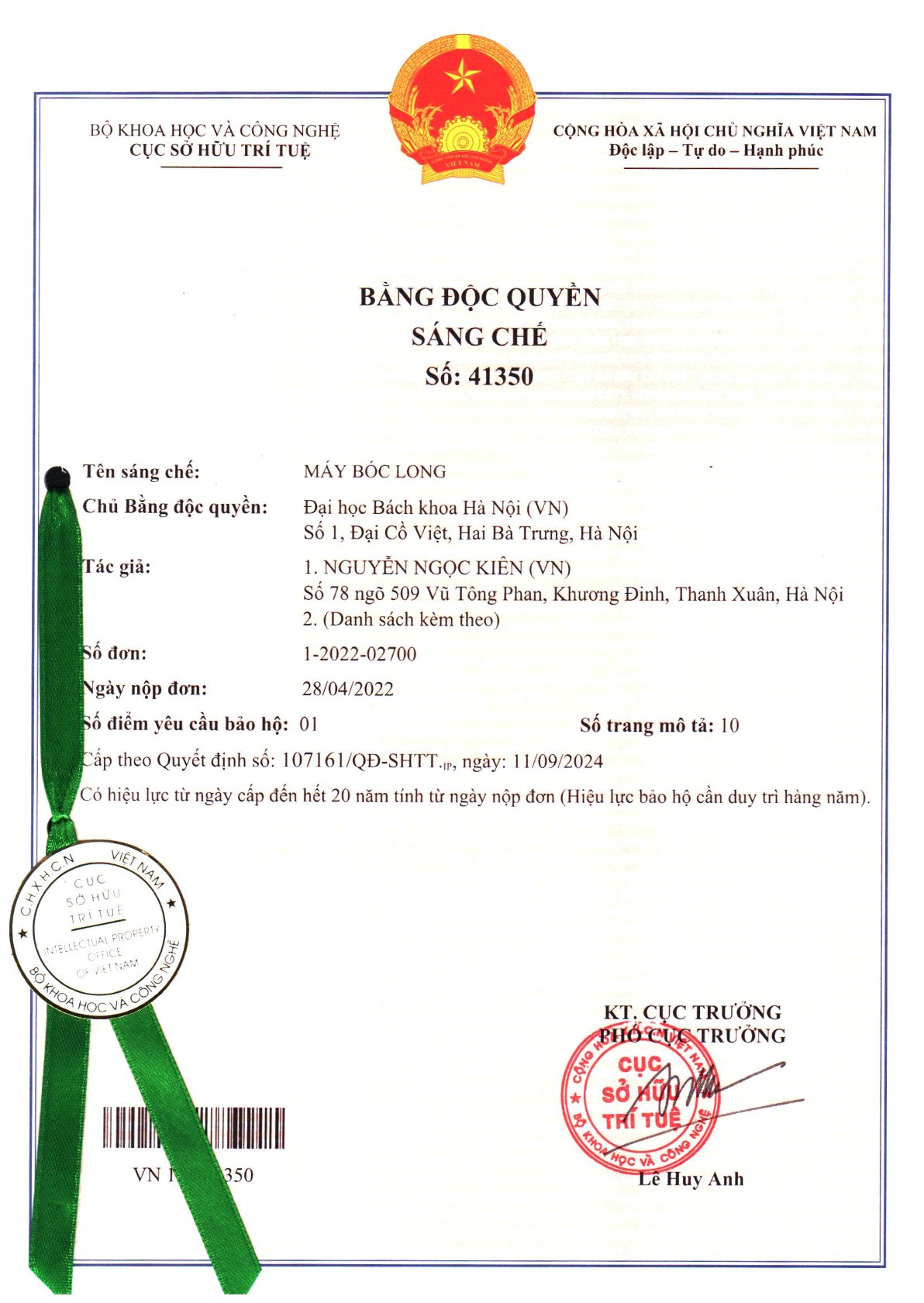 Tóm tắt: Sáng chế đề xuất máy bóc long bao gồm: cụm cấp phôi (1) gồm: đĩa cấp phôi (1.5) được lắp cứng với trục dọc (1.4) và dẫn động bằng động cơ (1.1) thông qua bộ truyền đai (1.2), bộ truyền trục vít-bánh vít (1.3), phôi được giữ trong bộ đồ gá tự định tâm (1.6) và quay cùng đĩa cấp phôi (1.5) trong quá trình tách hạt. Cụm tách hạt (2) gồm: dao tách hạt (2.2) được dẫn hướng thông qua đĩa dẫn hướng (2.1), quỹ đạo chuyển động của dao tách hạt (2.2) được tạo bởi cơ cấu cam mặt đầu (2.3), chuyển động của đĩa dẫn hướng (2.1) được cấp bởi động cơ (1.1) thông qua trục (1.4), các cụm này được lắp lên khung (1.7).