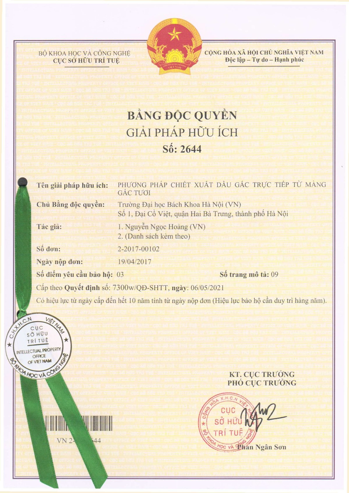 Phương pháp theo giải pháp hữu ích cho phép tăng thêm tới 40% lượng dầu chiết xuất được so với phương pháp ép truyền thống; lượng lycopen trong sản phẩm thu được tăng từ 1,3 đến 1,5 lần so với sản phẩm truyền thống; và không cần sấy màng gấc trước khi chiết xuất dầu nên giảm được chi phí năng lượng.