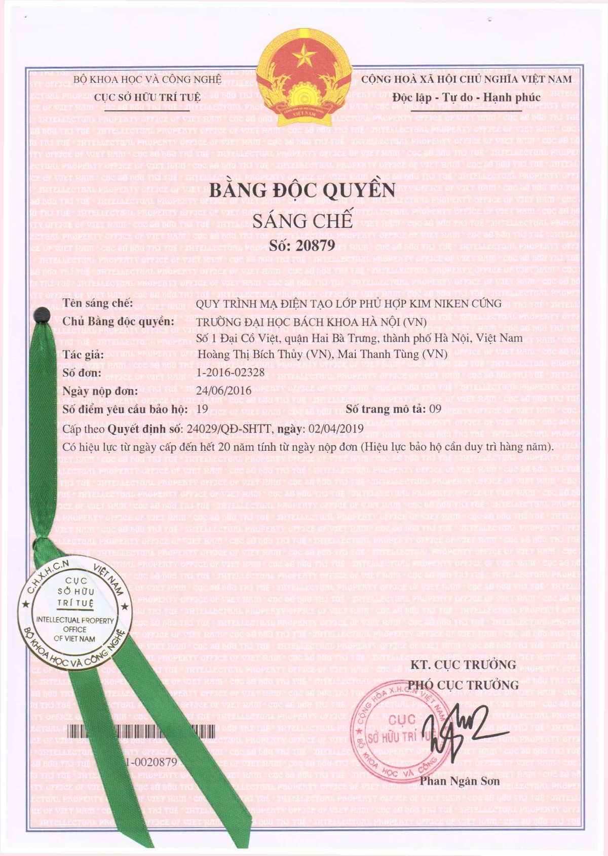 Tóm tắt: Sáng chế đề xuất quy trình mạ điện tạo lớp phủ hợp kim niken cứng (NiP với hàm lượng P > 10,5%) để chống ăn mòn cho các kết cấu, thiết bị khai mỏ, đặc trưng ở chỗ, dung dịch mạ gồm có muối chứa ion niken, chất khử chứa ion phốtpho, chất tăng tốc, chất đệm để giữ pH ổn định, phụ gia làm bóng, chống rỗ. Lớp mạ hợp kim NiP được tạo thành tại nhiệt độ 40 đến 80°C, mật độ dòng catốt trong khoảng 0,5 - 3 A/dm2. Lớp mạ hợp kim NiP thu được có thể tăng tính chống ăn mòn cho kết cấu nhưng vẫn chịu được lực va đập trong môi trường hầm lò.