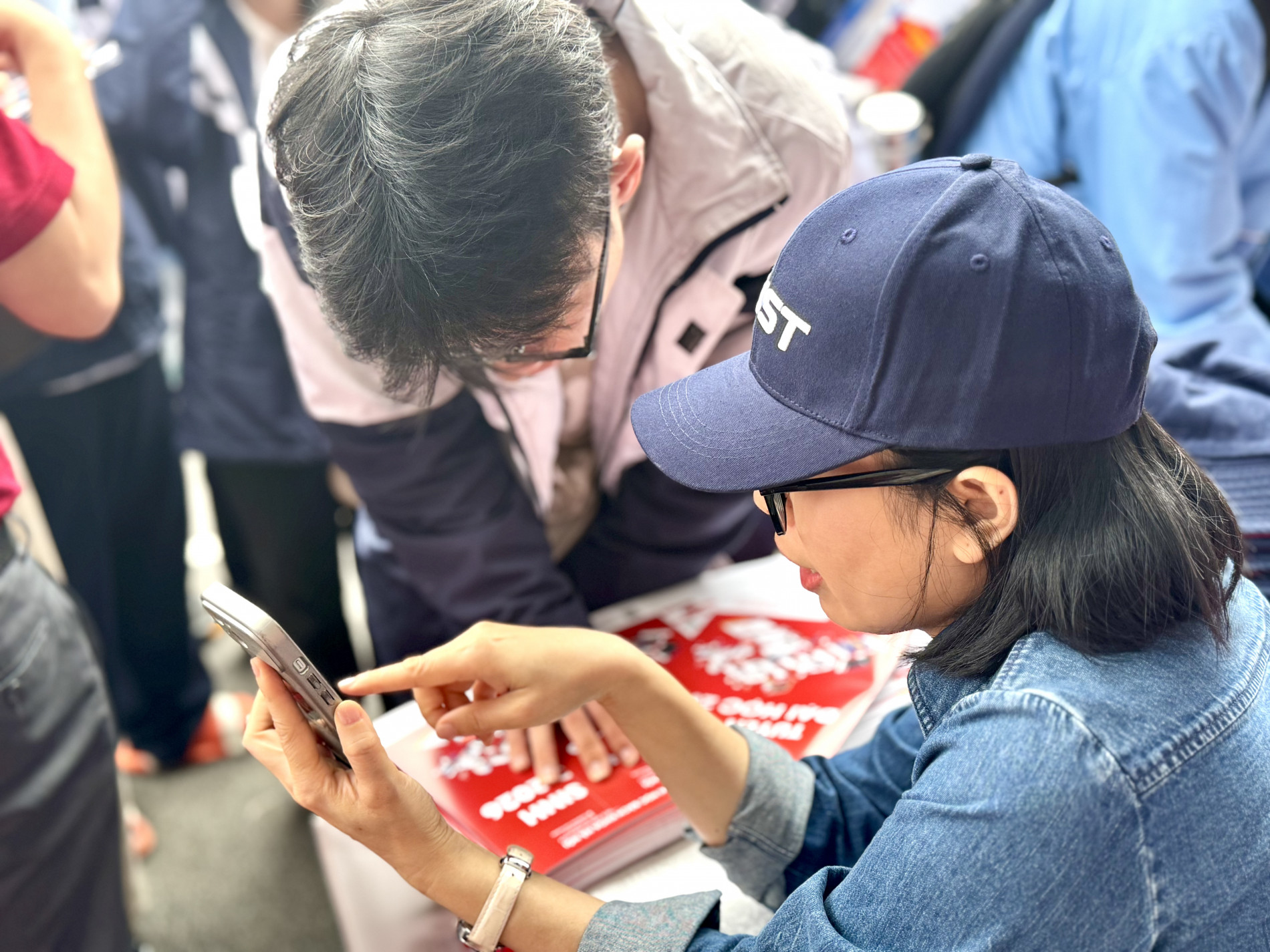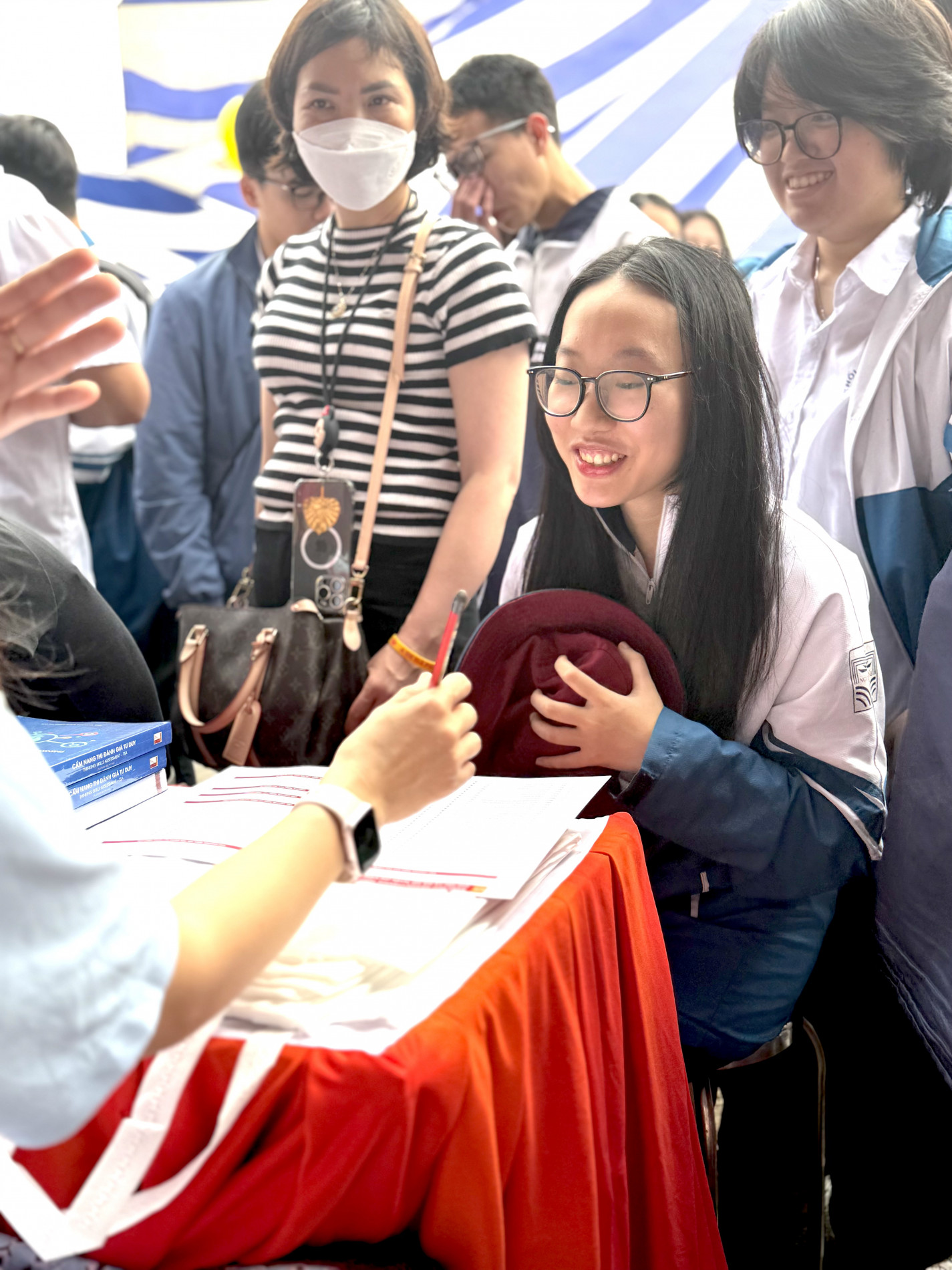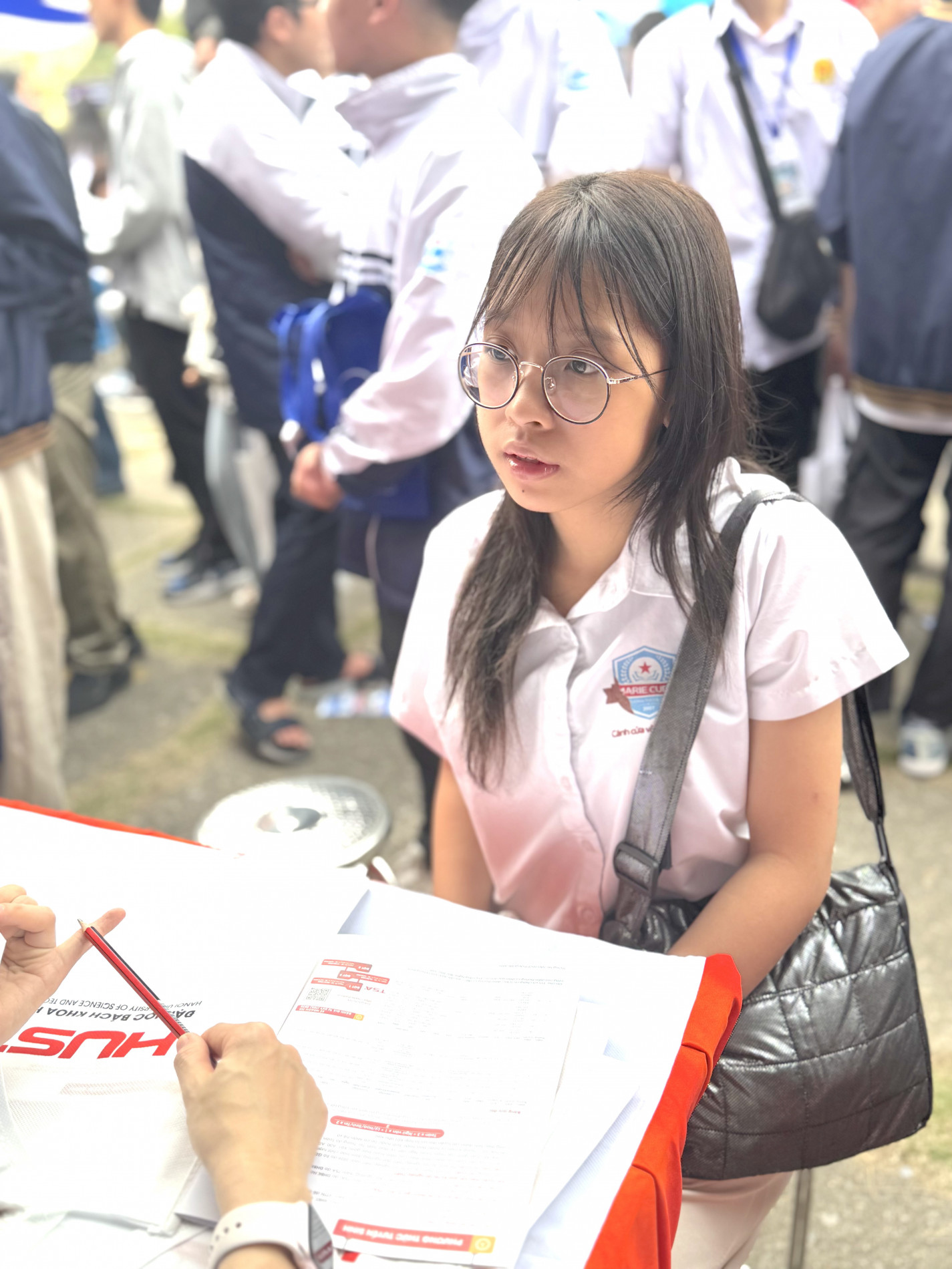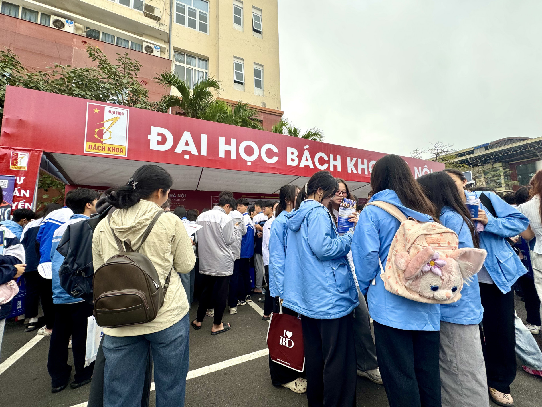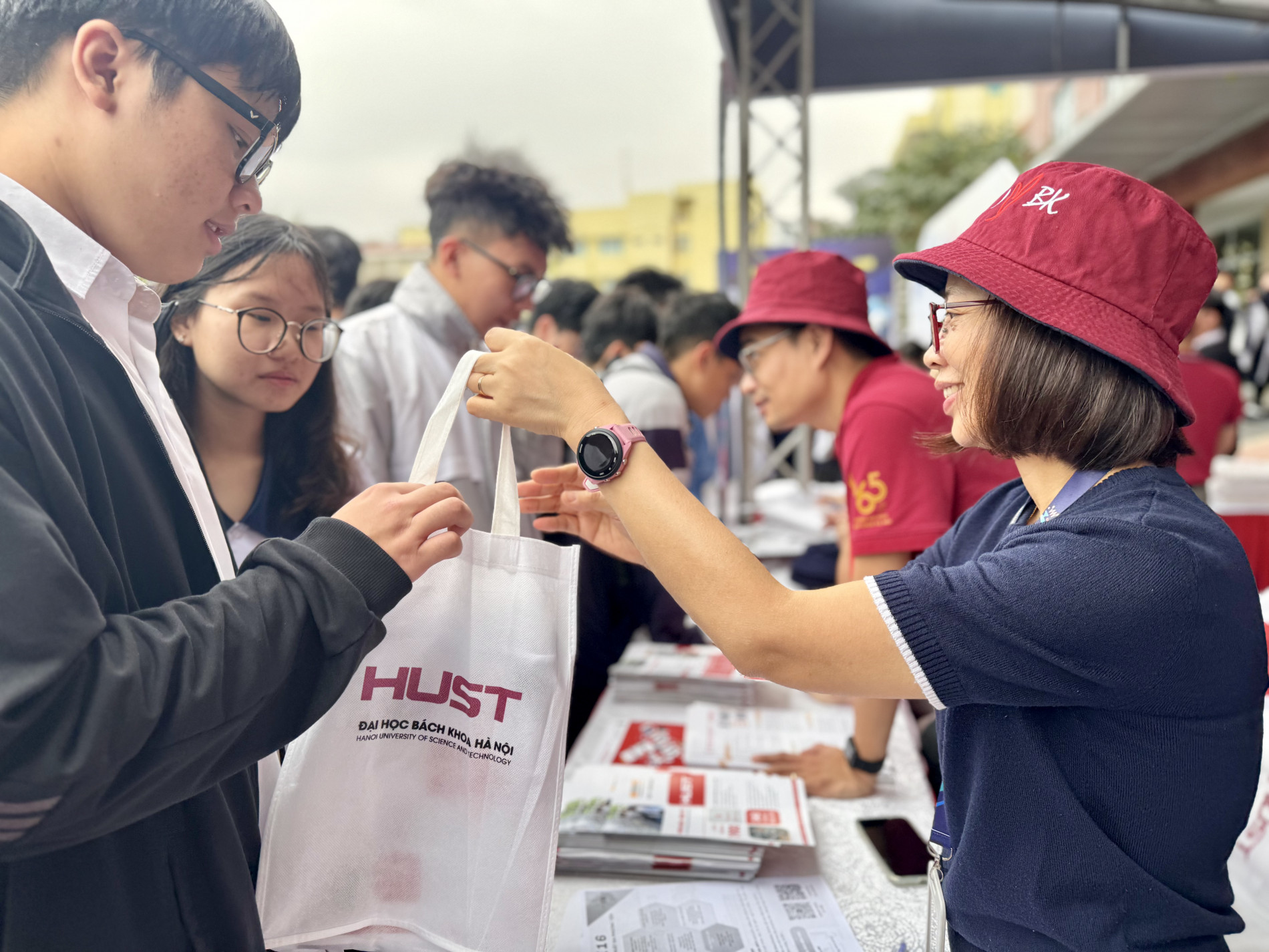 Tại gian tư vấn Đại học Bách khoa Hà Nội, phụ huynh và học sinh từ các trường cấp 3 lân cận xếp thành hàng dài, chờ đến lượt được tư vấn. Đoàn người đứng chật như nêm, nhưng gương mặt ai cũng rạng rỡ nụ cười vì được hỏi – đáp, nghe tư vấn, định hướng trực tiếp từ thầy cô Bách khoa Hà Nội. Đội ngũ thầy cô Bách khoa, với sự chuyên nghiệp của mình, kiên nhẫn giải đáp từng thắc mắc, gỡ rối lo âu cho từng phụ huynh và học sinh.