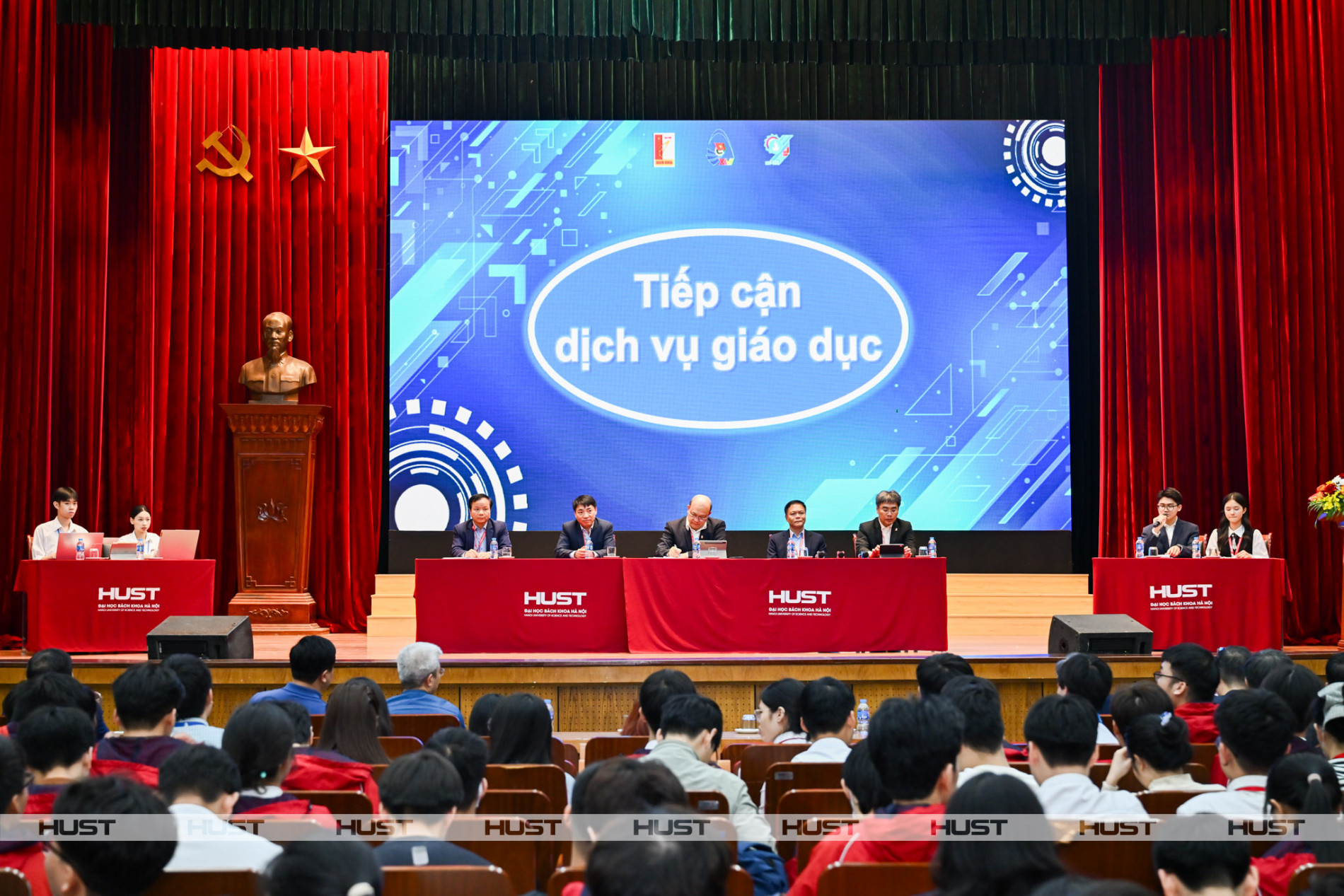 Sinh viên Nguyễn Kim Quý - Chủ tịch Hội Sinh viên đại học trình bày tổng hợp các ý kiến của sinh viênỞ nhóm vấn đề tiếp cận dịch vụ giáo dục, trong năm 2025 Nhà trường đã đẩy mạnh hỗ trợ trực tuyến, cải thiện giao diện hệ thống Quản lý đào tạo, triển khai chatbot hỗ trợ 24/7; các thông báo thay đổi lịch học được cập nhật kịp thời trên eHust; hệ thống thông tin, giấy tờ, đơn mẫu được đồng bộ trên iCTSV, eHust và các biểu mẫu trực tuyến.