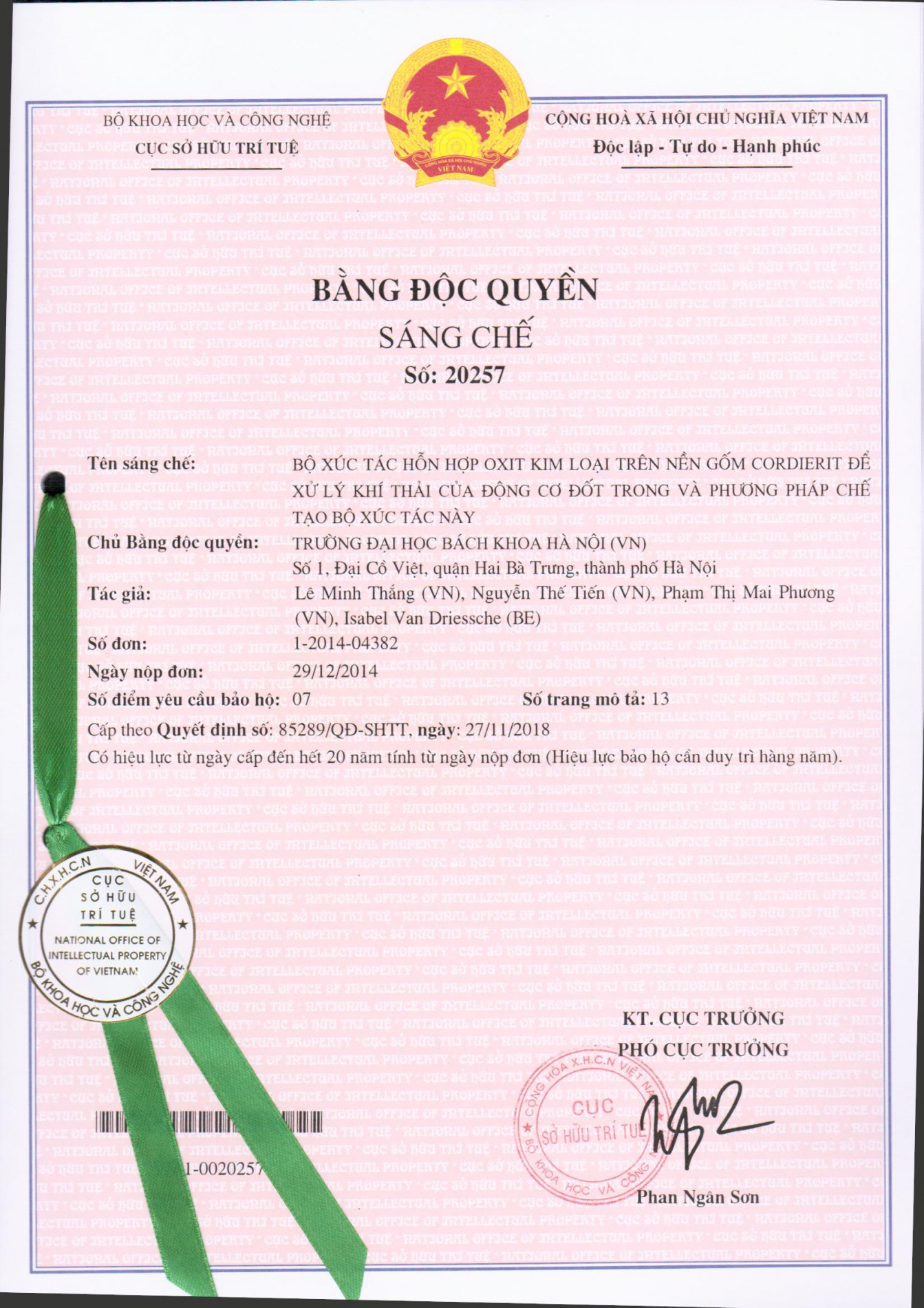 Tóm tắt: Sáng chế đề cập đến bộ xúc tác hỗn hợp oxit kim loại trên nền gốm cordierit để xử lý khí thải từ xe máy, ô tô và động cơ đốt trong khác và phương pháp chế tạo bộ xúc tác. Bộ xúc tác này bao gồm ba lớp. Theo thứ tự từ trong ra ngoài, lớp trong cùng là lõi, làm từ cordierit dạng khối tổ ong; lớp thứ hai là chất mang Al2O3-CeO2-ZrO2 phủ trên lõi, lớp ngoài cùng bao phủ bên ngoài lớp chất mang là lớp chất xúc tác MnO2-Co3O4-CeO2-ZrO2-BaO. Bộ xúc tác này có hoạt tính cao trong một khoảng rộng nhiệt độ từ 100 đến 1000oC, xử lý được trên 90% CO, hydrocacbon và trên 70% NOx trong khí thải từ các động cơ đốt trong.