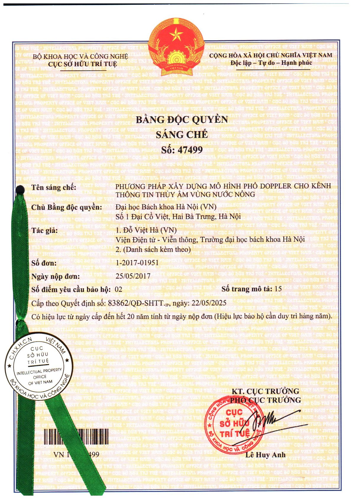 Tóm tắt: Sáng chế đề xuất phương pháp xây dựng mô hình phổ Doppler cho kênh thông tin thủy âm vùng nước nông, và mô hình toán học mô tả phổ công suất Doppler trong kênh thông tin thủy âm vùng nước nông. Mô hình phổ Doppler đề xuất cho kênh thủy âm là tổng của hai thành phần Gaussian và Spike. Trong đó, thành phần Gaussian mô tả các dịch tần Doppler do sự nhiễu động mặt nước gây ra, còn thành phần Spike mô tả các dịch tần Doppler do sự chuyển động tương đổi của máy thu phát gây ra. Để xác nhận tính đúng đắn của mô hình phổ Doppler đề xuất, sáng chế đã so sánh mô hình đề xuất với dữ liệu đo đạc phổ Doppler thưc tế tại vịnh Hạ Long, Quảng Ninh, Việt Nam vào ngày 9 tháng 6 năm 2015. Cụ thể, các thông số của mô hình đề xuất sẽ được xác định từ dữ liệu đo bằng thuật toán tối ưu LpNM. Kết quả so sánh cho thấy, mô hình đề xuất  phù hợp với dữ liệu đo. Nói cách khác, mô hình phổ Doppler đề xuất mô tả chính xác hiệu ứng Doppler trong kênh thông tin thủy âm.
