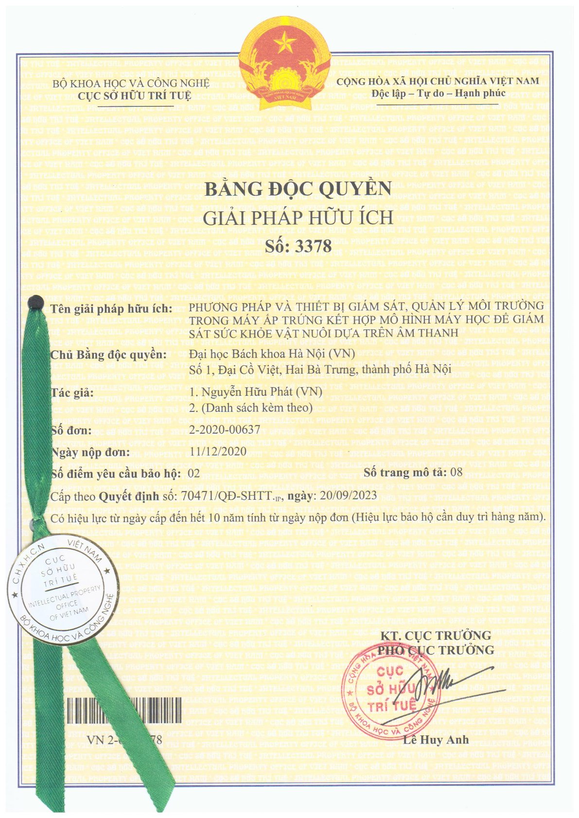 Tóm tắt: Giải pháp hữu ích đề xuất phương pháp, thiết bị giám sát, quản lý môi trường trong máy ấp trứng. Ngoài ra, đo đạc và hiển thị các thông số trong lò, các thông tin này còn được sử dụng để đưa ra các cảnh báo hoặc báo động nếu lò ấp có xảy ra hỏng hóc. Thêm vào đó, một quy trình phân loại âm thanh đề xuất cho thiết bị để chẩn đoán sức khoẻ vật nuôi dựa trên mô hình học máy tiên tiến.