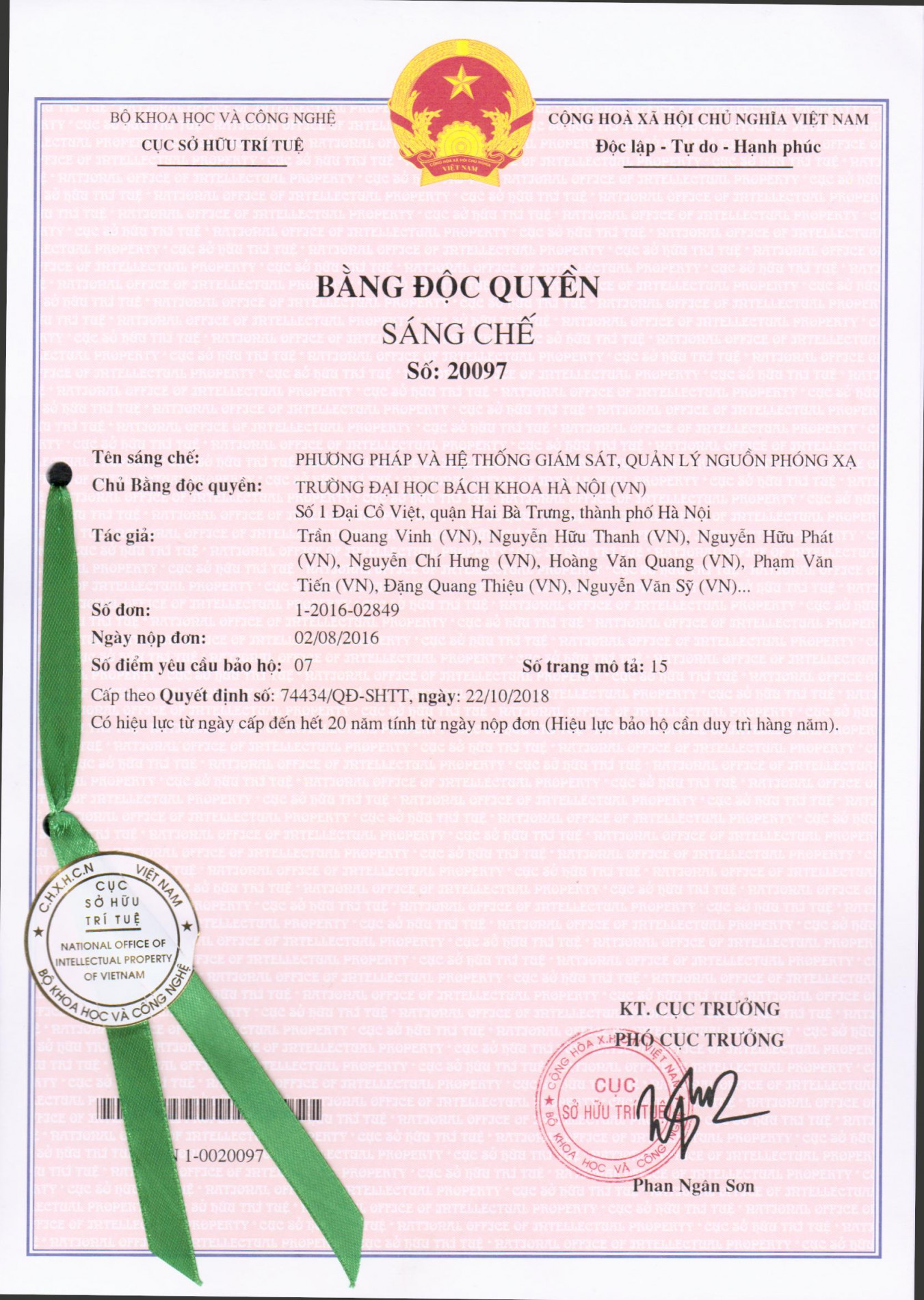 Tóm tắt: Sáng chế đề xuất phương pháp, thiết bị và hệ thống để giám sát và quản lý nguồn phóng xạ. Các bước thực hiện để giám sát nguồn phóng xạ di động bao gồm thu thập thông tin về vị trí, trạng thái thiết bị và mức phóng xạ, xử lý, đóng gói và truyền về trung tâm vận hành và giám sát. Ngoài ra, các thông tin này còn được sử dụng để đưa ra các cảnh báo hoặc báo động ngay tại thiết bị. Thêm vào đó, một quá trình giám sát song song nhưng hoạt động độc lập, sử dụng một thiết bị giám sát ẩn (Implant Tracker) giúp cảnh báo sớm những nguy cơ tiềm tàng mà có khả năng ảnh hưởng lớn hoặc vô hiệu hóa chức năng giám sát của thiết bị. Từ đó, nguồn phóng xạ sử dụng di động được quản lý và giám sát cả về vị trí và trạng thái chính xác, kịp thời.
