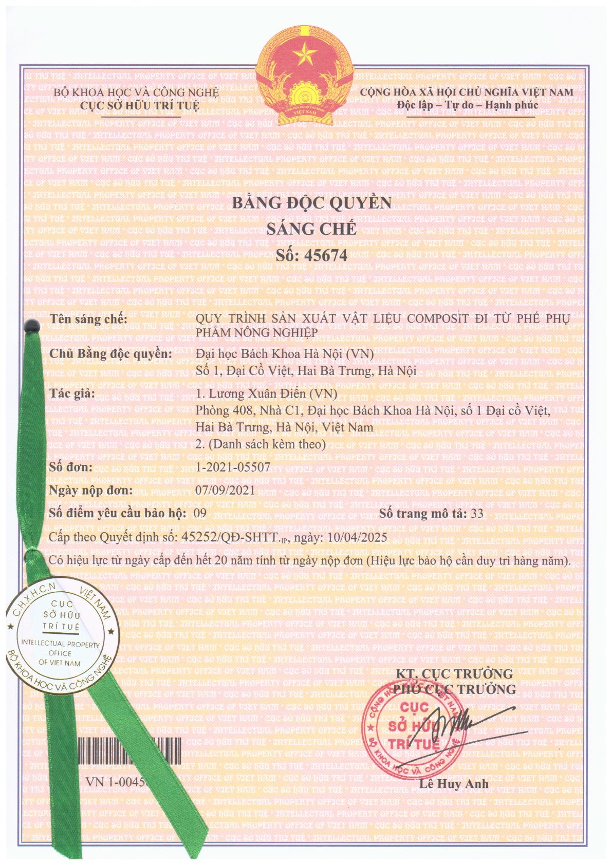Tóm tắt: Sáng chế liên quan đến quy trình sản xuất vật liệu composit từ nguyên liệu phế phụ phẩm nông nghiệp và hợp chất chứa nguồn kim loại. Quy trình này bao gồm các bước: làm sạch và nghiền nguyên liệu phế phụ phẩm nông nghiệp; thuỷ nhiệt nguyên liệu phế phụ phẩm nông nghiệp sau nghiền cùng với chất có tính axit và chất có tính oxy hoá; pha trộn cacbon thu được bằng cách than hoá thuỷ nhiệt phế phụ phẩm nông nghiệp nêu trên với nguồn nguyên liệu kim loại; và thuỷ nhiệt hỗn hợp nêu trên để thu được vật liệu composit đi từ phế phụ phẩm nông nghiệp. Vật liệu composit thu được có thể được sử dụng để xử lý khí NOx theo phương pháp khử xúc tác chọn lọc sử dụng NH3 là tác nhân khử, làm vật liệu xử lý khí CO, làm vật liệu xử lý chất hữu cơ dễ bay hơi, và làm vật liệu điện cực.